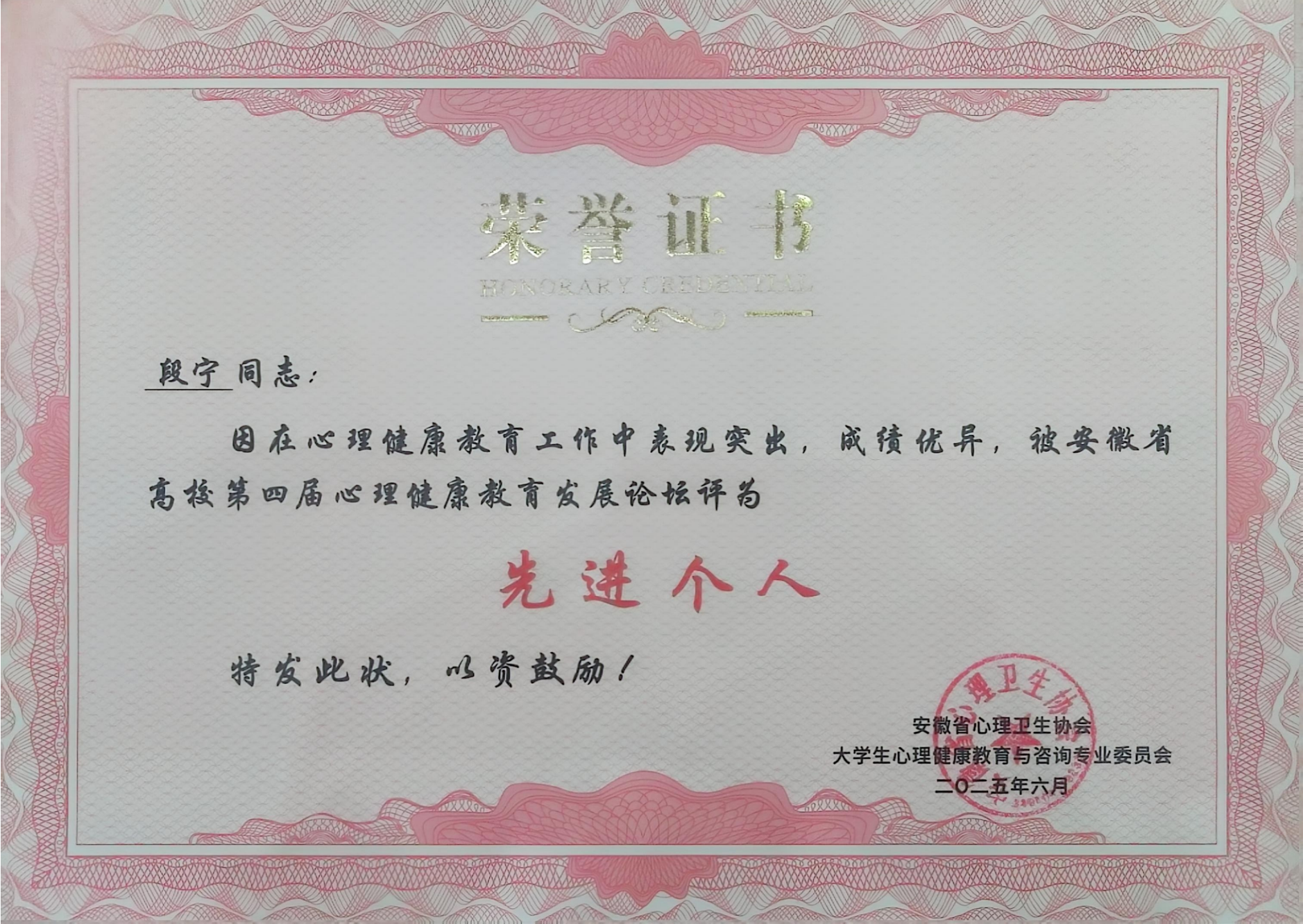 段宁老师荣获先进个人