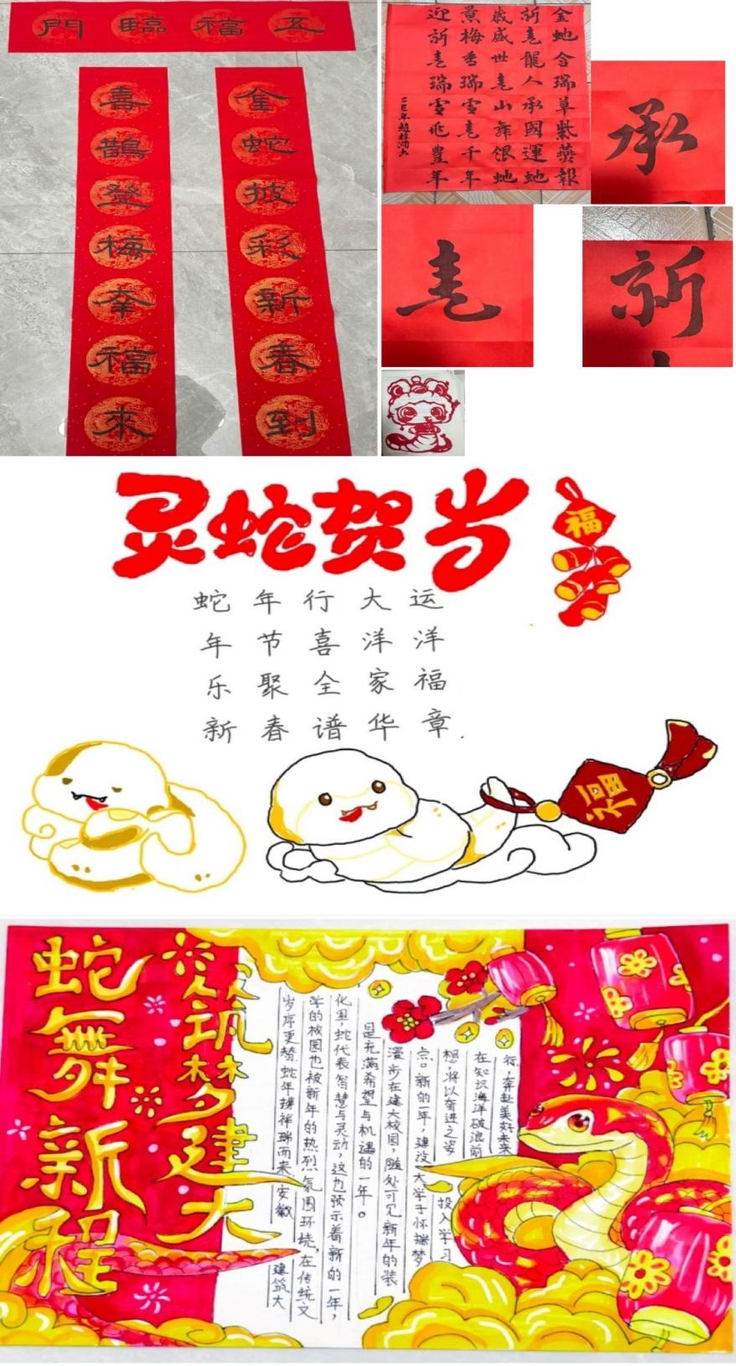 活动参与者们以巧手匠心创作出了形式多样、创意纷呈的作品,从精巧别致的剪纸、寓意吉祥的挂饰、细腻灵动的编织品,到笔墨丹青的绘画、遒劲有力的书法、妙趣横生的对联,再到活力四射的摄影作品。每一件作品都凝聚着同学们的心血与智慧,传递着对新年的美好祝愿与期许。经评审,共计12份优秀作品脱颖而出。这些作品充分融入了蛇的元素和寓意,有力彰显了传统文化的艺术魅力,生动展现了建大学子的创新精神与文化底蕴。