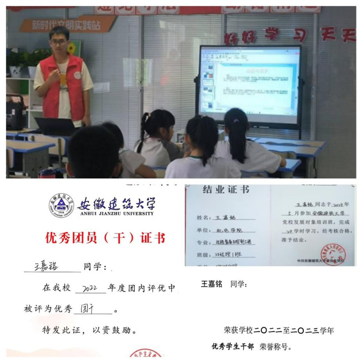 王嘉铭,安徽建筑大学机械与电气工程学院2022级过程装备与控制工程专业本科生,中共党员。曾荣获国家励志奖学金、校一等奖学金等。自大一以来,成绩一直保持优异,平均绩点3.84,位居专业第一,多门课程取得90+的优异成绩,现成功保研至华东理工大学动力工程及热物理专业。