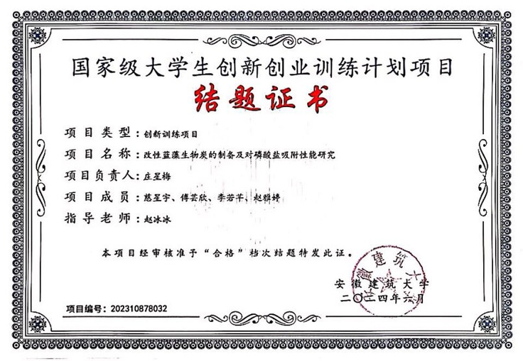 庄星梅的科研之路始于一次偶然。大一在校公选课《水污染控制技术概论》上,她听到老师讲到水体富营养化,联想到家乡那条逐渐失去活力的小河,内心深受触动。课后,她主动加入老师的课题组,开始参与改性生物炭的制备与磷酸盐吸附实验。这一兴趣很快转化为行动:她成功申报了一项国家级大学生创新创业训练计划项目《改性蓝藻生物炭的制备及对磷酸盐吸附性能的研究》,并以此为基础,撰写并发表了一篇中文综述《生物炭改性方法及其对水体磷酸盐吸附性能的研究》。进入大二后,她的科研视野进一步拓宽,开始参与土壤方向的实验,负责土壤培养、TOC提取等任务。她还系统学习了三维荧光光谱仪、纳米粒度与zeta电位仪等设备的使用,掌握了Origin、EndNote等科研软件,具备了独立开展实验与数据分析的能力。