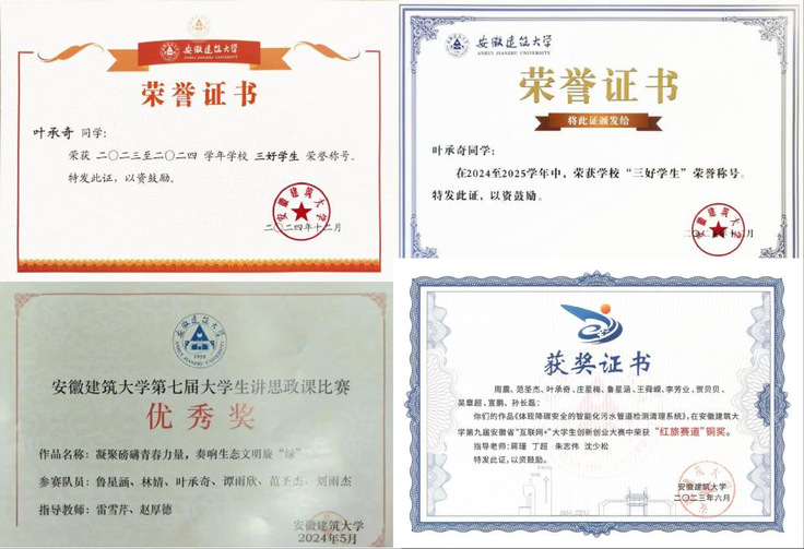 任职班长与学工助理期间,他创新推行“党建+科研”班级建设模式,组织班级共十八位同学积极参加大学生创新创业训练计划项目,个人连续三年获校“三好学生”,并带领班级连续三年获评校“文明班级”。荣誉背后,是他深夜修改班级科研项目申报书的身影,是他主动帮扶挂科同学的耐心。在学校第七届大学生讲思政课比赛中,他以《凝聚磅礴青春力量,奏响生态文明旋“绿”》为题,结合智能化污水管道检测清理系统的污染治理实例,将专业知识与国家战略相融合,获评优秀奖,成为践行“知行合一”的青年范本。