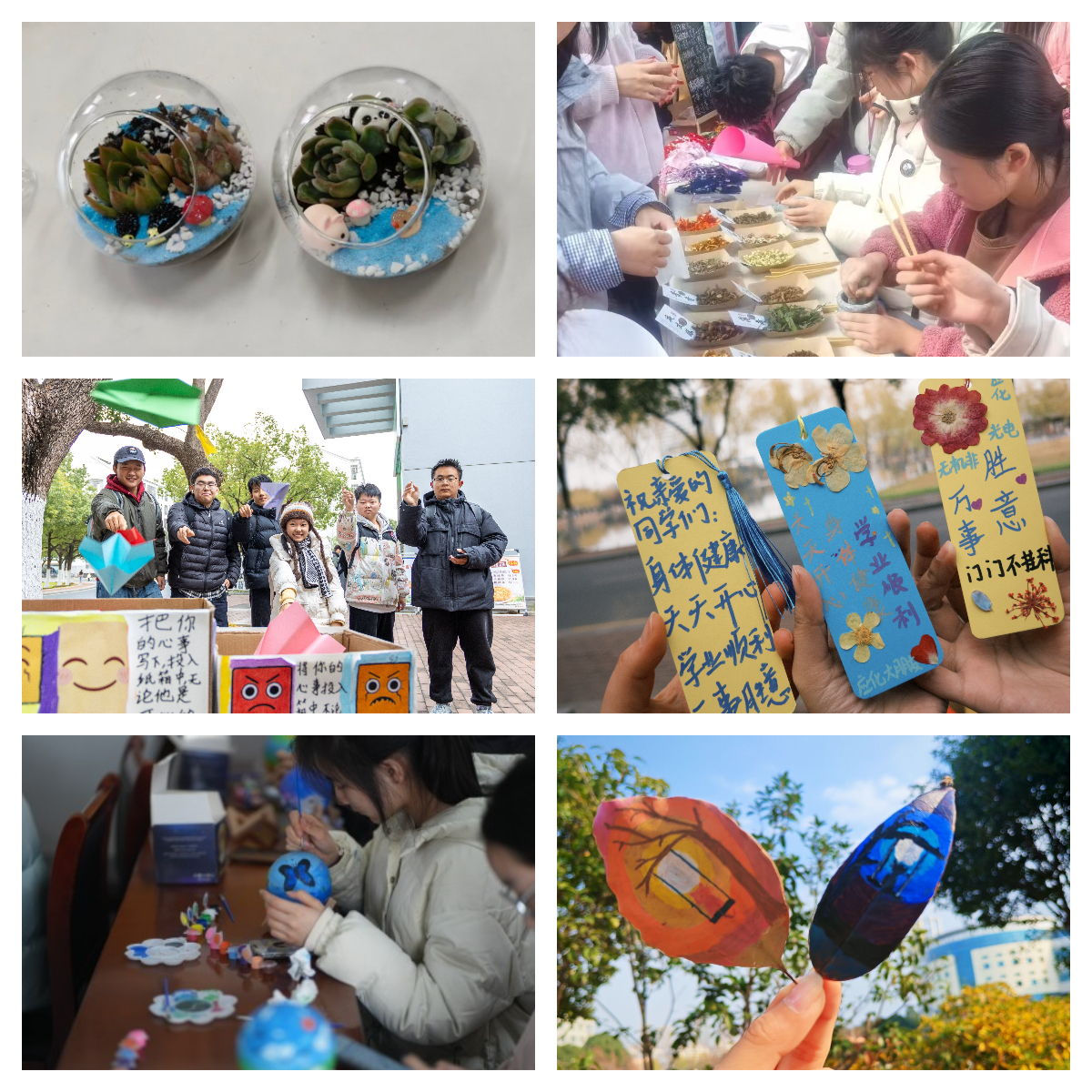 “巧手愈心”工坊系列为学生提供了丰富而沉浸的手工体验,引导大家在创造中探索自我疗愈。建规学院带领学生构筑植物微景观,在方寸之间设计心景;电信学院的香囊制作,让美好期许伴随香气留存;材化学院则将情绪宣泄与艺术表达创新结合,通过“纸飞机投递烦恼”与个性书签绘制,实现心绪的释放与转化;数理学院的手绘星球灯、机电学院的落叶创意画以及公管学院的种植体验,均让学生在指尖流动中体验创造的成就感与心灵的宁静。