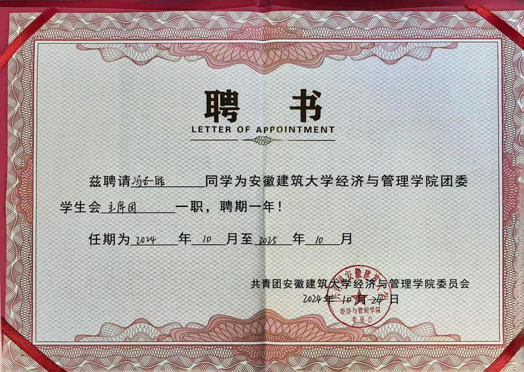 冯圣皓,中共党员,安徽建筑大学经济与管理学院2022级工程管理专业学生,现已保研(硕博连读)至浙江工业大学工商管理专业。在校期间,他曾获国家奖学金、校一等学业奖学金、优秀团员、三好学生等荣誉;在学生工作方面,他曾担任过经济与管理学院学生会主席一职,负责学院各类文体活动、志愿服务等工作;同时,他积极参与各类学科竞赛,曾在2023 年 ICAN 全国大学生创新创业大赛、2024年“高教杯”全国大学生成图大赛上均获得了国家级一等奖。