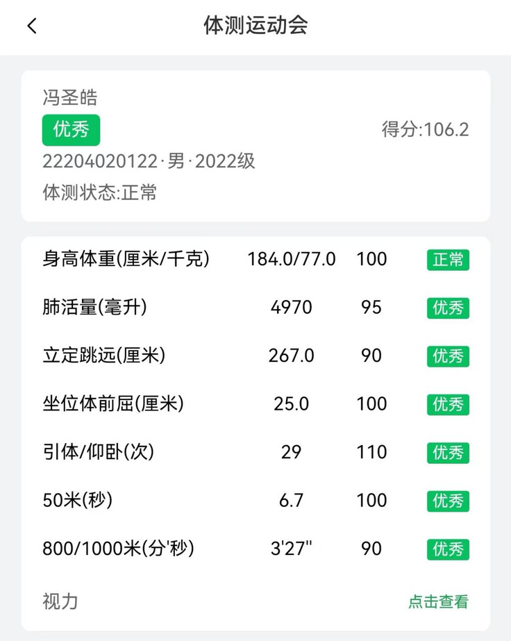 在紧张的学习节奏里,冯圣皓从不将运动锻炼视为额外负担。他始终坚持运动,将锻炼融入日常,将运动变成爱好。哪怕学业再繁忙,他也能利用碎片化时间动起来,让身体始终保持活力状态。