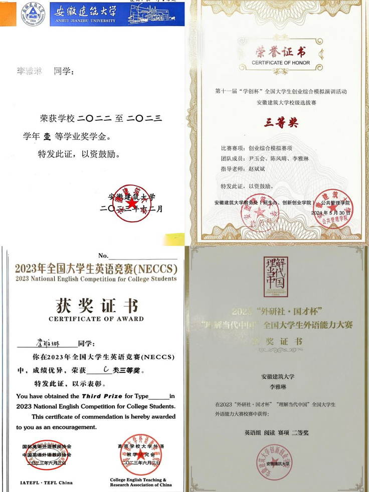 李雅琳,安徽建筑大学公共管理学院2022级劳动与社会保障专业本科生,曾荣获校一等奖学金、社会奖学金等。自大一以来,成绩一直保持在班级前列,平均绩点为4.09,位居专业第一。多门专业课程取得90+的优异成绩,现成功保研至安徽大学企业管理专业。