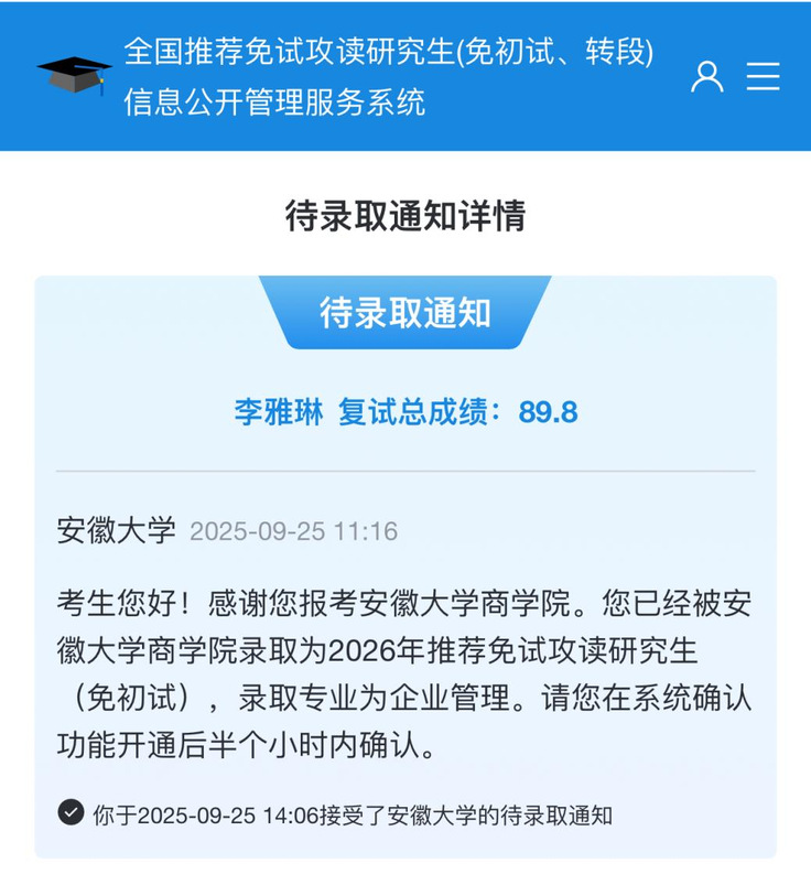 从安徽建筑大学到安徽大学,这四年的成长离不开学校的培养、老师的指导、朋友的帮助和家人的支持。在李雅琳看来,推免不是终点,而是新的起点。最后,她想对学弟学妹们说:大学四年转瞬即逝,要珍惜每一分每一秒的时光。明确方向,深耕学习,丰富实践,调整心态,相信大家都能在自己选择的道路上闪闪发光!(文/图:林兴勇、李雅琳;一审:江侠,方绍正;二审:帅英;三审:汤娜,徐庆和)