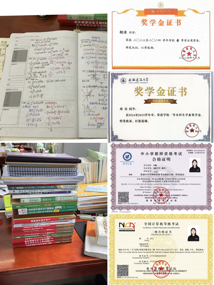 数学向来是不少大学生的“拦路虎”,但胡洁却靠“笨功夫”啃下了这块硬骨头。在高数、线代和概率论的学习中,胡洁没少下“笨功夫”:课上她会把老师的推导步骤认真地记在笔记本上,连公式的适用条件都用不同颜色的笔标注清楚;课后坚持刷20道对应章节的习题,碰到求导错漏、矩阵秩的判定卡壳时,她就抱着练习册去找同学讨论——有时三人对着一道二重积分题算半个小时,从积分区域的画图到换元法的选择,把每个步骤都掰扯明白才肯罢休。此外,她大一就通过了英语四六级,成绩520+,除了专业课学习,在空余时间她还通过了高中数学、政治教师资格证考试、取得了省级、国家级计算机二级证书。
