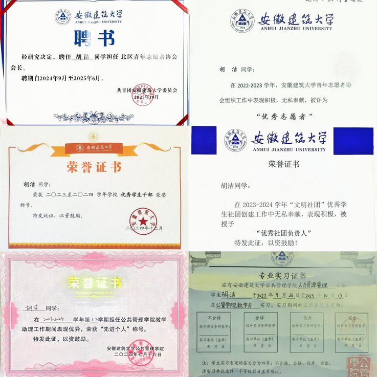 在学习与竞赛活动之余,胡洁在学工助理以及志愿服务活动中也留下了扎实且具有积极意义的足迹。大一期间,她担任公管学院教学办学工助理,协助老师完成资料收集整理、活动纪要撰写等工作,熟练掌握文书处理、数据整理技能;作为班级团支书,她始终秉持服务意识,成为同学们信赖的贴心伙伴。加入北区青年志愿者协会的三年里,她主导或参与志愿服务活动30余次,还曾担任协会会长,凭借自身行动带动更多同学投身志愿事业。因表现突出,她先后获评“先进个人”“优秀志愿者”“优秀社团负责人”“优秀学生干部”等多项荣誉,在实践中诠释了当代大学生的责任与担当。