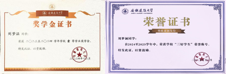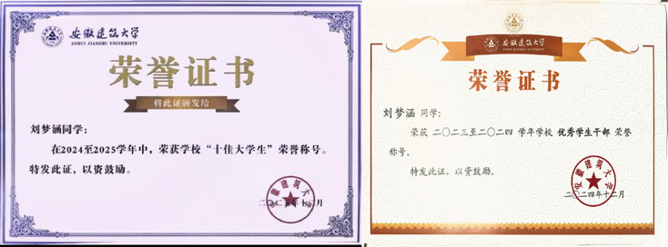 刘梦涵,中共党员,安徽建筑大学数理学院声学专业2022级学生。在校期间,她始终以高标准要求自己,前三学年平均学分绩点3.85,取得专业第一的优异成绩。连续三年荣获学校一等学业奖学金,并获“十佳大学生及年度标兵”、“黄山奖学金”社会奖学金、“优秀学生干部”、“三好学生”等多项荣誉。她积极投身科研竞赛,将以第一作者身份发表SCI一区论文,在数学建模领域屡获各种奖项。凭借其卓越的综合表现,她获得声学专业唯一的保研资格,在推免中收获哈尔滨工程大学、合肥工业大学、三峡大学等多所高校的橄榄枝,最终勇敢选择跨专业保研至三峡大学电气工程专业,用扎实的步履书写了一段从声学到电气的跨界成长之旅。