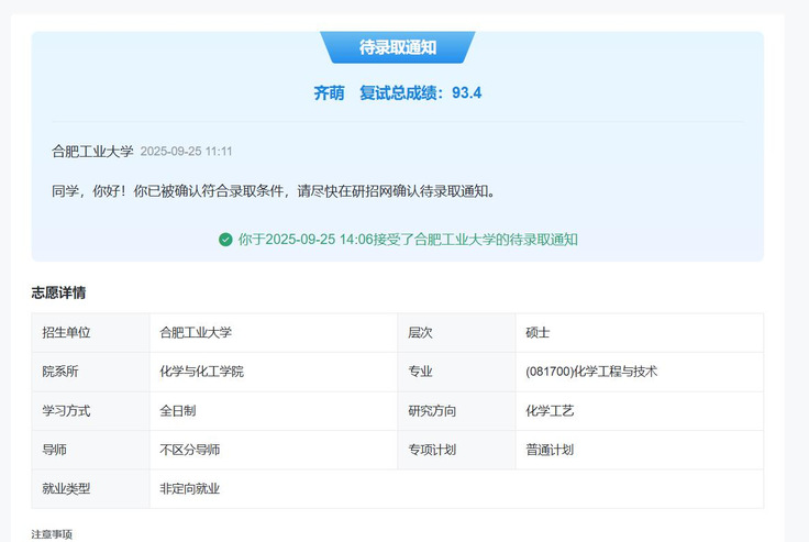 在选择深造学校时,她综合考虑了学科实力、研究方向和个人发展规划,最终锁定了合肥工业大学化学工程技术专业。“合工大在化工领域有深厚的积累,他们新能源材料方向的特色很鲜明,和我的兴趣很契合。”齐萌解释说。