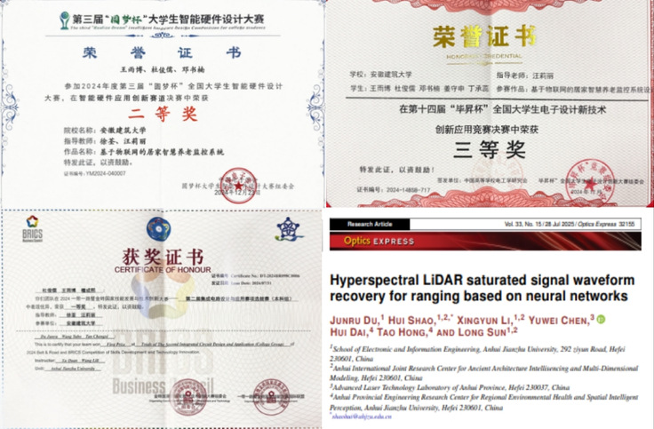 杜俊儒,中共预备党员,安徽建筑大学电子与信息工程学院通信工程专业2022级学生。在校期间学业成绩优异,综合排名稳居专业前列。大一即通过大学英语四、六级考试。曾获国家励志奖学金、校学业奖学金,并多次荣获“三好学生”“优秀学生干部”“优秀学工助理”等荣誉称号;在科研与学科竞赛方面表现突出,作为核心成员参与国家级大学生创新创业训练计划项目,获得“圆梦杯”电子设计大赛二等奖、“毕昇杯”电子设计大赛三等奖等。尤为突出的是,在本科期间,他即以第一作者身份在SCI二区期刊上发表论文《Hyperspectral LiDAR saturated signal waveform recovery for ranging based on neural networks》,该研究专注于高光谱雷达饱和回波信号的恢复。现已保研至中国科学院大学杭州高等研究院光电信息工程专业。