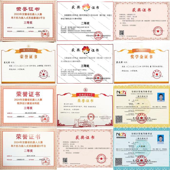 在安徽省网络与分布式系统创新设计大赛中,他和团队成员运用Wireshark抓包分析、渗透测试等技术,设计多层级网络防护体系,获省级二等奖。此外,他还荣获蓝桥杯安徽赛区C/C++程序设计二等奖、安徽省机器人大赛单片机赛道二等奖、安徽省大学生电子设计竞赛三等奖、大学生创新大赛省银奖等多项荣誉,在竞赛中进一步深化了个人实操能力。