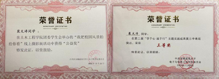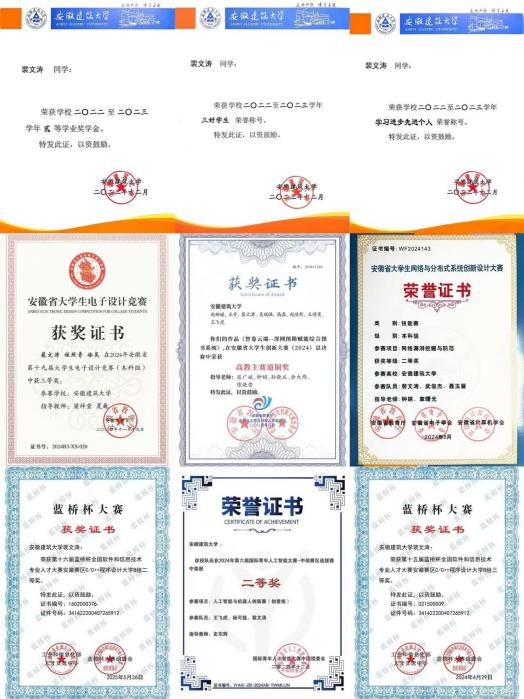 全面发展,勇担使命:裴文涛同学在德、智、体、美、劳多方面均衡发展,始终保持着强烈的集体荣誉感与社会责任感。他积极参与各类学术交流活动,乐于分享自己的学习经验与技术心得,为身边同学答疑解惑,发挥了良好的榜样示范作用。在科研与竞赛之余,他注重综合素质提升,通过参与各类实践活动锤炼担当精神,展现了新时代大学生全面发展的优良风貌。