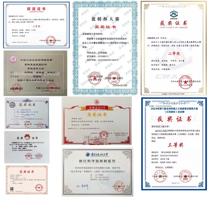 大一、大二阶段,刘明恺主动参与多项专业竞赛,旨在通过实践检验学业成果,探寻自身发展潜力与方向。期间,他凭借扎实的专业功底,获中国机器人及人工智能大赛国家级三等奖、中国大学生数学建模竞赛省级二等奖,以及计算机设计大赛、睿抗机器人开发者大赛等多项省级奖项。