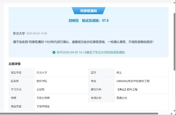 面对时间紧迫、机会有限的现实情况,刘明恺广泛投递院校申请、主动联络目标导师,先后向二三十所院校投递申请,获得面试机会后,便第一时间与导师沟通交流,围绕目标院校的研究方向开展针对性准备。面试环节中老师的提问多集中于科研内容本身,刘明恺对研究细节的深刻把握与清晰阐述,让他在交流过程中从容不迫、应对自如。最终,他成功被东北大学软件学院软件工程专业录取。