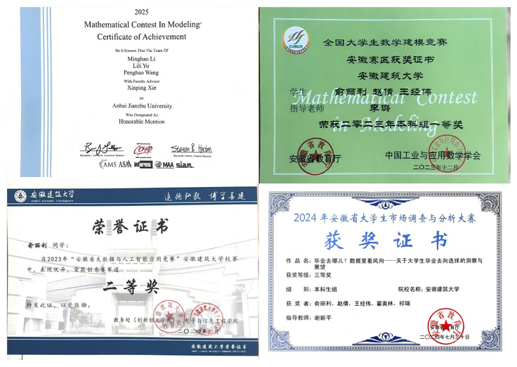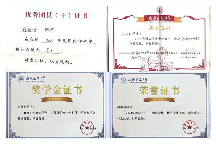 俞丽利,中共党员,安徽建筑大学电子与信息工程学院2022级计算机科学与技术专业本科生,任班级团支书。俞丽利专业成绩优异,前六学期平均学分绩点达4.06,位列专业第一。在校期间,多次获得校学业奖学金及社会奖学金,并荣获“三好学生”“优秀干部”等荣誉称号。在学科竞赛方面,曾荣获美国大学生数学建模竞赛(MCM/ICM)Honorable Mention、全国大学生数学建模竞赛安徽赛区一等奖、大数据与人工智能应用竞赛安徽赛区二等奖、计算机设计大赛安徽赛区三等奖等多个奖项,并参与1项省级大学生创新创业项目。现已保研至合肥工业大学计算机技术专业。