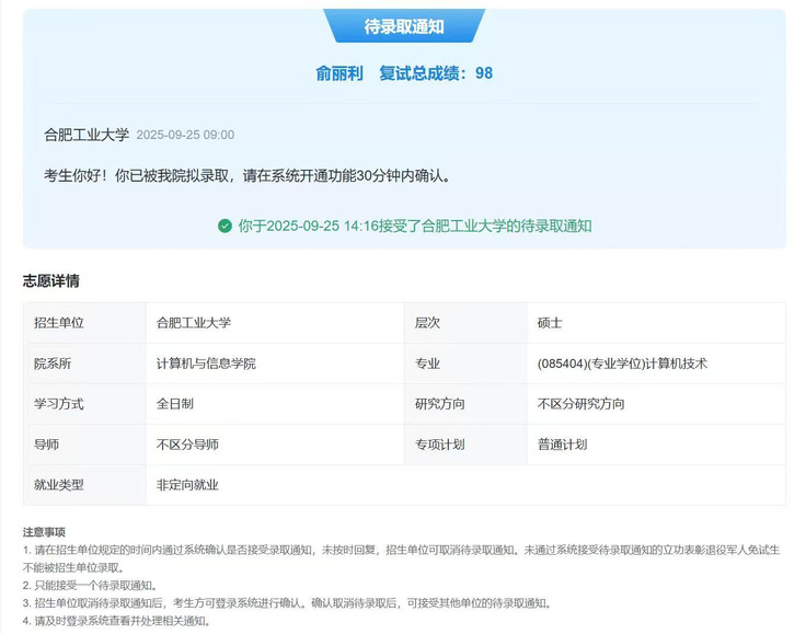 回望大学四年,俞丽利心中充满感激:感谢专业课老师在学术上的引领与点拨,感谢辅导员始终如一的信任与支持,也感谢团队伙伴在每一次挑战中的携手前行。从初入校园的些许迷茫,到如今面对未来的清醒从容,她的成长,是一场静默扎根、终于花开的旅程。“苦尽甘来终有时,一路向阳待花期。”未来,俞丽利将怀揣本科阶段积累的知识与经验,步入合肥工业大学继续钻研专业知识,以技术为笔,书写服务社会的担当。(文/图:楚君、俞丽利;一审:丁媛媛、方绍正;二审:帅英;三审:张润梅、徐庆和)
