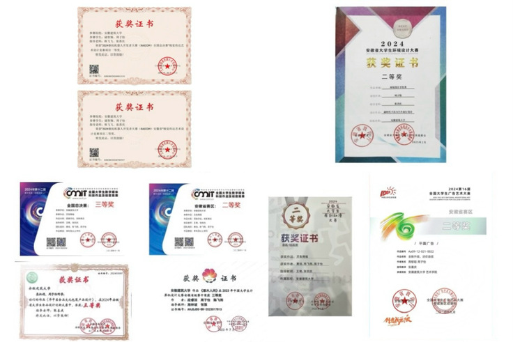 在各类专业竞赛中,周子怡积极备赛,全面提升自己的设计能力与创新思维。她先后在睿抗机器人开发者大赛、全国大学生广告艺术大赛、安徽省大学生环境设计大赛、全国大学生数字媒体科技作品及创意竞赛等多项赛事中斩获国家级、省级奖项。这些经历不仅锻炼了她短时间内高效产出创意方案的能力,更让她在与其他高校优秀学子的交流中拓宽视野、激发灵感。对她而言,竞赛不仅是荣誉的角逐,更是检验学习成果、突破自我边界的舞台。