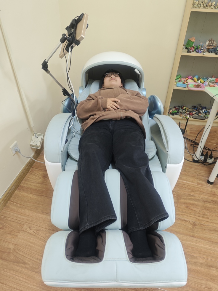 在身心减压舱体验区,同学们则体验了集多模式按摩、零重力姿态调节与专业声疗于一体的智能放松功能。符合人体工学的舱体内,可选择不同的放松模式,通过系统的物理按摩与声音引导,能有效缓解肌肉紧张与疲劳,快速达到身心放松、恢复平静的状态。