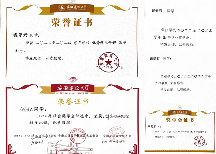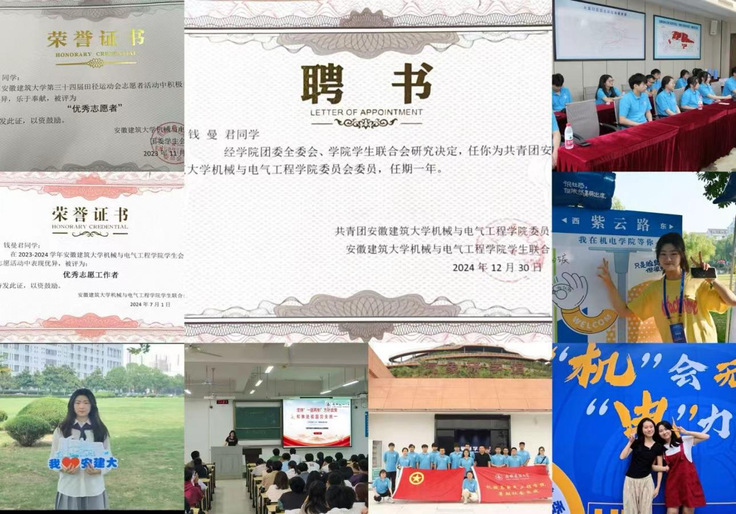 “用知识武装头脑,用实践锤炼本领,用奉献温暖他人,用青春书写担当。”这是钱曼君的青春誓言。她深深感激母校安徽建筑大学提供的学习环境、师资培养与成长平台,正是这片沃土滋养了她的梦想。如今,她即将踏上合肥工业大学的新征程。我们相信,怀着安建大赋予的“进德、弘毅、博学、善建”的精神烙印,她必将在电气工程领域继续深耕,在未来的人生舞台上绽放更加璀璨的光芒,成为新时代工科青年的卓越榜样。(文/图:朱永双、钱曼君;一审:何鹤立、方绍正;二审:帅英;三审:叶少宝、徐庆和)