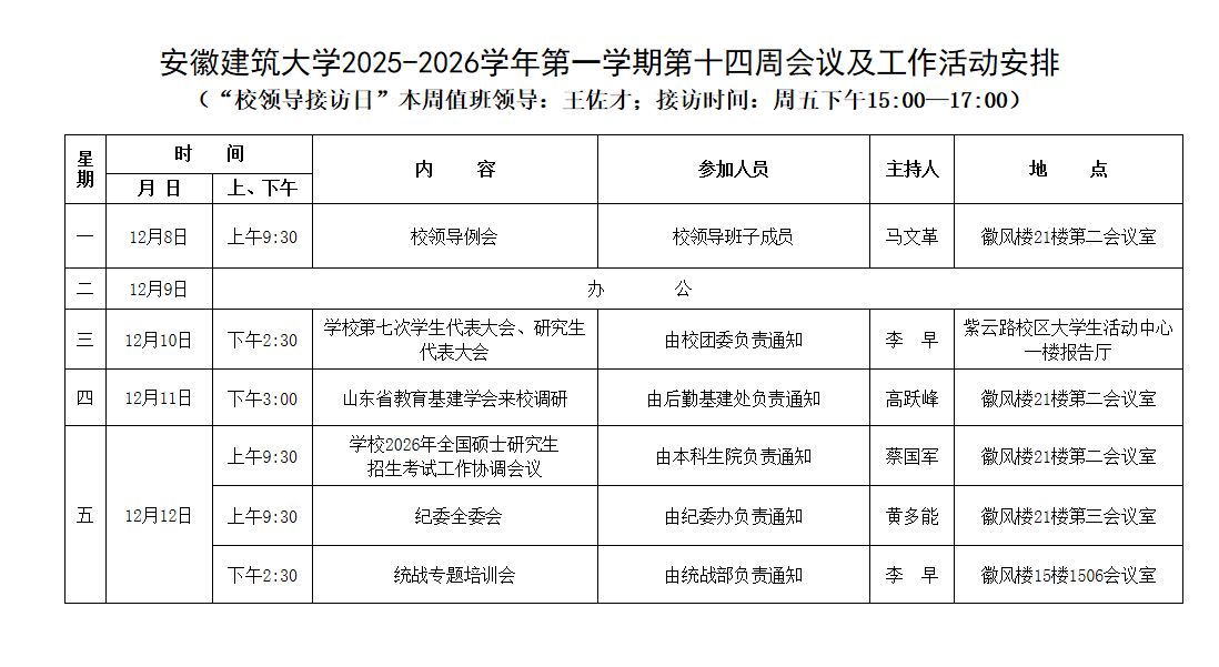 安徽建筑大学2025-2026学年第一学期第十四周会议及工作活动安排
