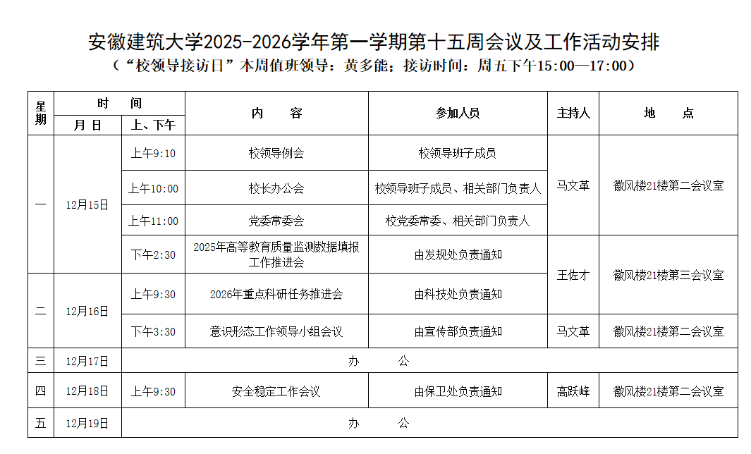 安徽建筑大学2025-2026学年第一学期第十五周会议及工作活动安排