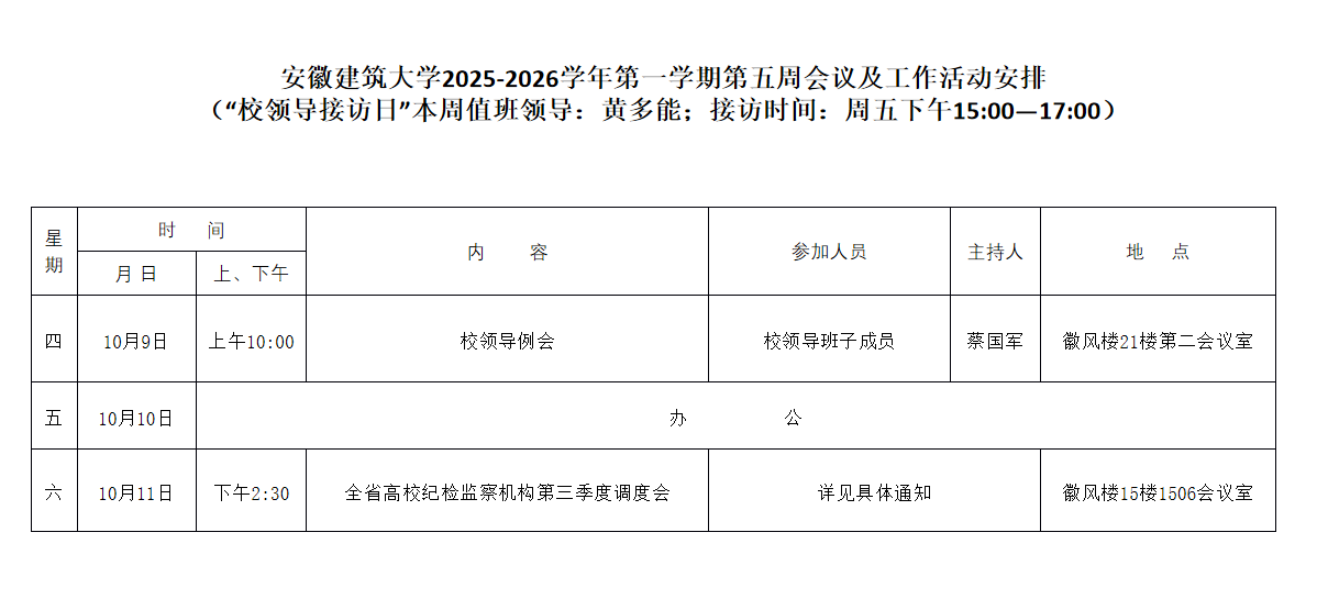 安徽建筑大学2025-2026学年第一学期第五周会议及工作活动安排