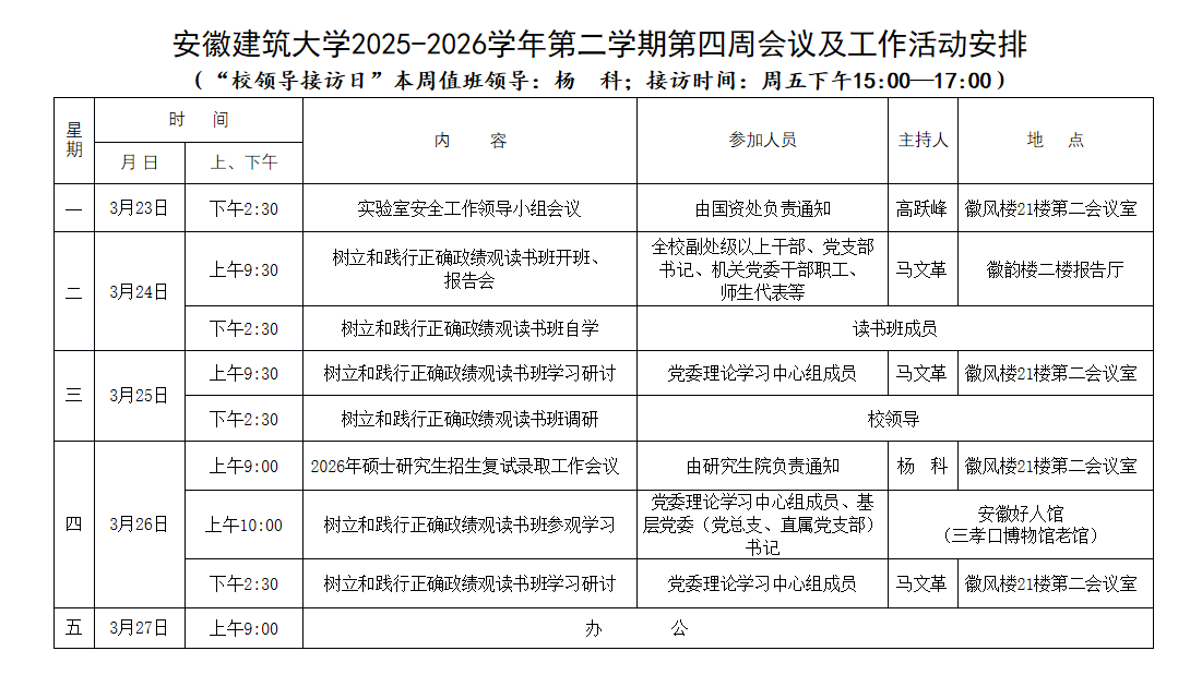 安徽建筑大学2025-2026学年第二学期第四周会议及工作活动安排