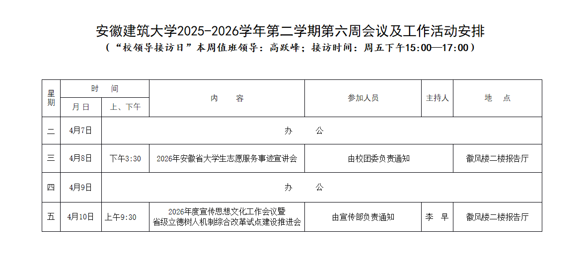 安徽建筑大学2025-2026学年第二学期第六周会议及工作活动安排