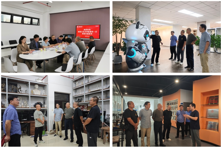 座谈结束后,在安徽建筑大学艺术学院副院长(主持工作)张乐、副院长黄成陪同下,沈院长一行参观了艺术学院国家级动漫人才培养试验区、公共艺术实验室、徽州雕刻工程技术研究中心和数智文旅“科研特区”,详细了解了学院在实践教学、科研创新与社会服务方面的成果与特色。这些实验室和科研平台的建设成果给沈院长一行留下了深刻印象。